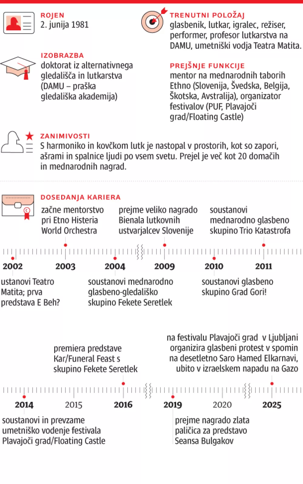 Že njegova prva predstava E Beh? (2002), ki je nastala po študiju pri legendarnem mojstru Brunu Leoneju v Neaplju, je začrtala smer: spoj tradicije ročnih lutk, improvizacije in neposrednega stika z občinstvom. Leto pozneje je zasnoval mednarodni glasbeni projekt Etno Histeria World Orchestra, ki je postal stalnica njegovega ustvarjanja, med letoma 2004 in 2011 pa soustanovil še tri glasbene zasedbe – Fekete Seretlek, Grad Gori! in Trio Katastrofa.