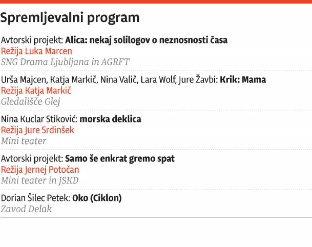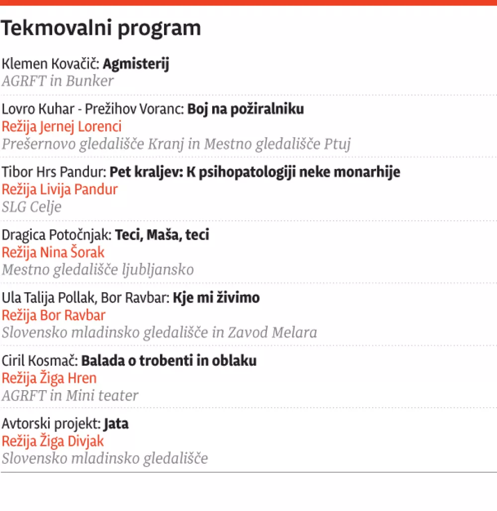 Za tekmovalni program sem izbrala uprizoritve, ki so izstopale tako po problemskih zastavkih kot po uprizoritvenih rešitvah. Kot se je izkazalo, skoraj vse obravnavajo ključna vprašanja, ki zadevajo