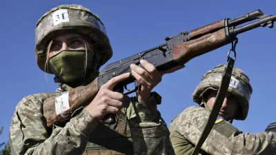 In this photo provided by Ukraine's 65th Mechanized Brigade press service, recruits practice military skills on a training ground in a sunflower field in the Zaporizhzhia region, Ukraine, Monday, Aug. 25, 2025, (Andriy Andriyenko/Ukraine's 65th Mechanized Brigade via AP) / Foto: Andriy Andriyenko