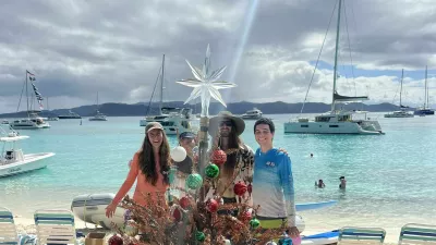 Na južni polobli je zdaj vrhunec poletja, pravzaprav živijo na otoku Boyne v večnem poletju. »Temperature nad 30 stopinj, visoka vlaga in skoraj nič dežja. Božični čas preživljamo kje ob vodi, večinoma na plaži ali čolnu, tudi reko in veliko jezero imamo v bližini. Tisti, ki imajo bazen, se namakajo ves dan. Lučke, božično okrasje, sneženi možje in sanke so malce smešni v tej vročini. Namesto belega božiča imamo prepečeno travo. V Queenslandu se znoči okoli 19.30, takrat se s prižgano klimo v avtu množično peljemo gledat lučke po ulicah,« opisuje.