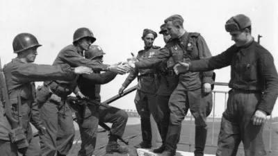 Znamenita fotografija srečanja zaveznikov na reki Elbi. Takšnih prizorov je bilo v tistem času veliko in nihče ni razmišljal o kakšni novi, tudi ne o hladni vojni. / Foto: Avtor neznan/Dokumentacija