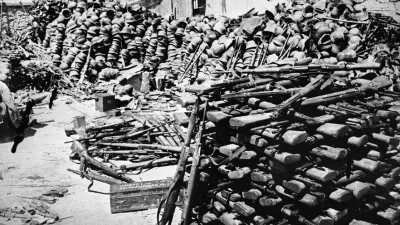 Prizor iz krimskega mesta Sevastopol po predaji nemških vojakov in kolaborantov. Nagrmadilo se je ogromno vojaške opreme, večino so srhanili v vojaških skladiščih. / Foto: Jevgenij Kaldej, Sovjetski arhiv