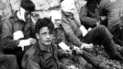 Skupina ameriških vojakov kmalu po izkrcanju v Franciji. Pri izkrcanju je sodelovali več kot 150.000 zavezniških vojakov. Več kot 10.000 je bilo med njimi žrtev. / Foto: Ameriški nacionalni arhiv