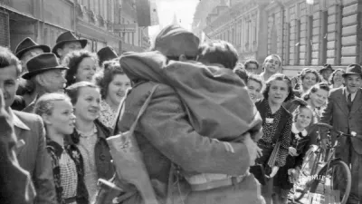 Prizor po osvoboditvi Ljubljane. Mnogi tovariši se niso videli več let, družine so bile razmetane, mnogi so v bojih padli. Vseeno je bil to dan za veselje in srečo. / Foto: Hrani Muzej novejše in sodobne zgodovine