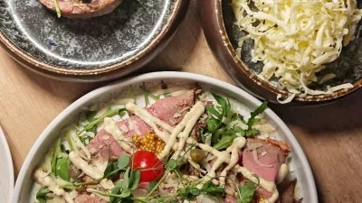 Taljata rečejo ohlajenim rezinam opečene govedine, ki jih kje drugje poimenujejo angleški rostbif, v vsakem primeru pa je bila to sočna hladna predjed, ki ji za volumen dodajo preveč rukole in grahovih poganjkov. Veliko je bilo tudi tatarskega bifteka, začinjenega bolj bogato, kot smo vajeni pri novodobnih mesnih minimalistih, in to nas ni prav nič motilo.