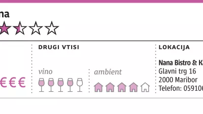 V sicer lepo urejenem prostoru, a malce pretemni, vsekakor pa zaradi muzike preglasni jedilnici, smo jedli eno najslabših večerij v zadnjem času. Pravzaprav se ne spomnimo, da bi v Mariboru kdaj tako slabo jedli. Mnogih jedi, ki jih je jedilni list obljubljal, sploh niso imeli, tisto, kar je bilo na zalogi, pa je bilo pripravljeno brez občutka. Zdelo se nam je celo, da bi kljub ne ravno pozni uri pri Nani rajši videli, če bi se naša ekipa zabavala kje drugje.