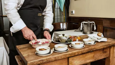 Vino naj bi pokrilo predvsem tople predjedi. Tudi tradicionalno govejo juho (osem evrov), ki jo enostavno nalijejo na rezance, zelenjavo in meso. Jed, ki se kot večina jedi na jedilniku že leta ni spremenila – in še dobro, da je tako.