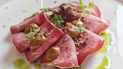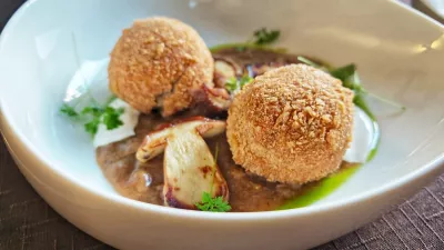 Vsaj na enaki ravni so bili tudi ješprenjevi arančini z gobovim ragujem in popečenimi jurčki. Toplih predjedi niti nimajo na pretek, še račja jetra in raviole s postrvjo, naj pa na tem mestu omenimo, da se za kosilo do četrte popoldne spoprimejo z enostavnimi, še malo manj kompliciranimi jedmi, ocvrtim piščancem in kolinami.