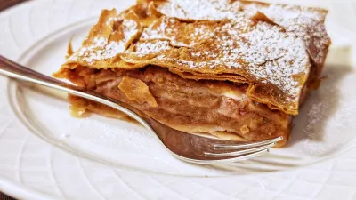 Morda, če ne zahtevamo preveč, bi ga lahko rezali pri mizi, kot to radi počnejo na zahodu. Jabolčni zavitek ni bil presladek, sploh ne, porcija pa ni bila gorenjska, ampak velika.