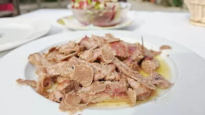 Beli tartufi sicer niso obveza, če jih ne marate, vam fuže zabelijo tudi z golažem, mi pa smo se pri mesu raje ozrli po edini glavni jedi, ramsteku. Natočili so nam kozarec hišnega refoška, liter stane 15 evrov, a po pitnosti ne ujame malvazije, meso pa narezali kot taljato in nanj naribali tartufe, kar je vse skupaj podražilo na konkretnih 40 evrov. Ja, beli tarufi niso šala in naštete jedi, čeprav so jih stregli v polovičnih porcijah, so na koncu stale okoli 80 evrov na osebo.