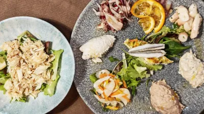 Kot se že malce razume v boljših ribjih restavracijah, pa naj gre za slovenske ali bližnje italijanske, v začetku dobesedno briljirajo s krožniki hladnih predjedi. Podobno ali morda še bolje je pri Godini. Izbrali smo krožnik s celim naborom predjedi, ki lahko tekmuje z najboljšimi: sipo narežejo in pripravijo v solati, enako je s kalamari in hobotnico, a je treba reči, da v teh solatkah ne pretiravajo s kisom, več je oljčnega olja.