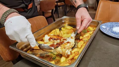 Predlagali so jo pečeno v pečici, kjer se je z njo družil krompir, in rezultat je bil fantastičen, količine ene porcije pa bi zadostovale za dva lačna.