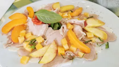 Gremo k hrani. Veliko burrato podložijo s paradižnikom, zabeljenim s tržaško omako, za hrustljavost poskrbi popečena panceta. Idealna jed k svežemu belemu kruhu. Med hladnimi predjedmi, kamor sodijo tudi domači siri in d'Osvaldov pršut, morate pokusiti vsaj še rezine pečene svinjske vratovine. Nekoč smo jih tukaj že jedli z naribanim hrenom, zdaj, poleti, so jih osvežili z marelicami, breskvami, melono in češnjevimi paradižniki.