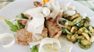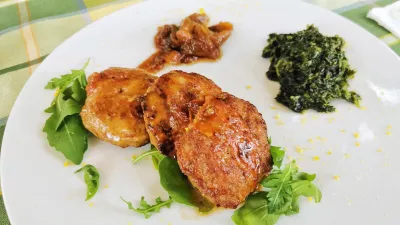 Po drugi strani so pečeni telečji medaljoni ravno prav mehki, k njim naribajo sir in korenje ter dodajo pražene bučke. Sijajen krožnik in ko se vrnemo v Števerjan, moramo pojesti še tistih nekaj jedi, ki jih tokrat nismo pokusili.
