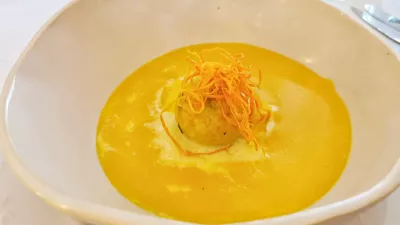 Po širokem začetnem izboru je logično sledila juha. Šlo je za zanimivo, gosto korenčkovo kremo, ki jo nalijejo na cmok polente in potresejo s hrustljavimi rezanci iz korenja. Zraven so predstavili presenečenje dneva, izvrsten laški rizling Tempus 2017 in kot nekakšno primerjavo dve leti mlajši laški rizling iz kleti Dveri Pax.