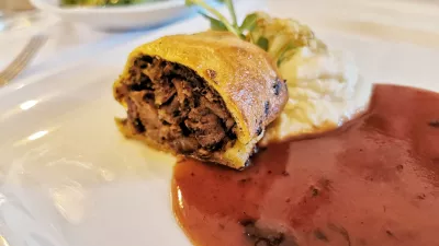 A še nismo končali. Mesni finale sta predstavljala goveji rep v testu s pirejem iz zelene in cvetače ter stegno divjega prašička. V kozarcih sta se vrtela Verusov modri pinot (2016) in v naših krajih vse premalo cenjena Koglova rdeča zvrst shiraza in modrega pinota. Obe vini sta izvrstno pokrivali hrano, še posebej, če dodamo, da je divjačino ob kruhovem cmoku in brstičnem ohrovtu spremljala češnjeva omaka.