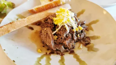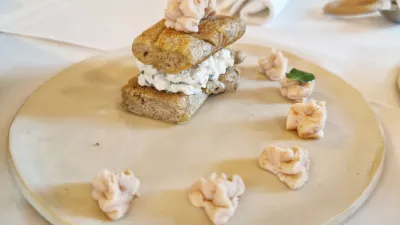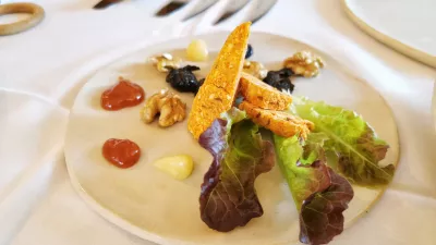 V nekakšni poenostavljeni degustaciji ali kar pregledu vsega, kar kuhinja zna, so stregli lokalne, rahlo avtorsko prirejene jedi. Pot od hladnih jedi proti sladicam in sirom je ob toplem kruhu začela vedno zaželena »oljova govedina«, torej kuhana govedina z bučnim oljem in čebulo. Pomagal je »sirek«, sušenemu liptaverju podoben lokalni sir, ki so ga spremljali suhe slive, orehi in šipkova marmelada. V isti začetni seriji so blesteli še rolana potrebušina krškopoljca, lardo in zaseka, pa tudi ajdov blin z drobnjakovo skuto in pašteto dimljene postrvi. Uvod, ki ga je spremljal vedno učinkovit Verusov šipon, je bil vsaj pisan, če ne kar bogat, in bi si ga lahko mnogi gostinci vzeli za vzor.