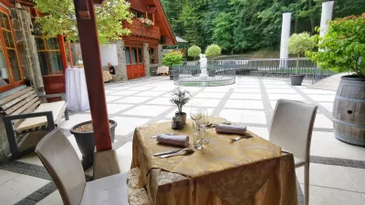 Gostilna pod Krvavcem in njena okolica sta natančno, mestoma skoraj preveč natančno urejeni. Ob robu gozda teče romantičen potoček, nad njim se pnejo veliki stilizirani beli stolpiči, ki vabijo h kakšni, ne ravno intimni poročni slovesnosti. Pred hišo škropi moderna fontana, zadaj za teraso je otroško igrišče, da mladi rod ne moti resnih obrokov.