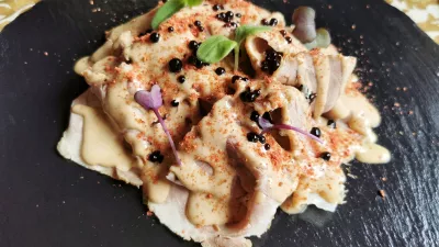 Jedilni list ni obsežen, nekaj pa je gotovo – postrvi so v glavni vlogi in na voljo v številnih pojavnih oblikah, ki se znajdejo tudi v ribjem meniju za 33 evrov (mesni stane enako). Na svojem mestu je recimo živo rdeč karpačo postrvi, ki ga najprej marinirajo v rdeči pesi, mu dodajo pomarančni gel in natrgan peteršiljev biskvit, že tako pisanemu krožniku pa pomaga še kaviar iz balzamičnega kisa. Med hladnimi predjedmi ima posebno mesto tudi zanimiva variacija italijanskega vitella tonnata. Ta se pod Krvavcem spremeni v »maiale tonnato«, s tunino omako namreč prelijejo pečeno, ohlajeno in na rezine nalistano svinjsko vratovino. Zanimiva in okusna kombinacija, ki jo podložijo z ledenko in potresejo (spet) z balzamičnim kaviarjem.