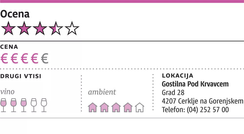 V ozadju igrajo slovenske popevke, medtem ko k mizam na začetku nosijo različne žganice z macesnovčkom na čelu. Če ste za »nižje alkohole«, imajo na mestu popularno Slapšakovo penino brut, sicer pa je na hladnem tudi kak kozarec Krvavške penine. Ta ne prihaja s krvavških pobočij, kot bi pomislili, ampak gre za hišni peneči zelen iz največje vipavske kleti. Naše omizje je najprej pozdravilo Slapšakovo penino za šest evrov in pol na kozarec in tudi nato ostalo v istih krajih s kletjo Albiano oziroma njihovim prijetnim chardonnayjem za tri evre in pol, glavne jedi je spremljala klet Movia z rdečo zvrstjo Turno za pet evrov. Škoda, da pod Krvavcem solidne vinske ponudbe ne zapišejo na vinski list.
