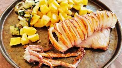 Treba je pa reči, da je jedilni list pri Ribiču zelo izčiščen: ne pri hladnih ne pri toplih uvodnih in ne pri glavnih jedeh ni gneče, kar poenostavi naročanje. V mestu piščancev smo seveda naročili piščančje prsi, ki jim pripadajo ajdova kaša z gobami, ocvrta kroglica ajdove kaše in črne trobente. Velika, okusna, a z 22 evri skoraj predraga glavna jed se je borila z najboljšo jedjo popoldneva, jadranskim lignjem orjakom, ki so mu pristavili pečen krompir ter simpatično kombinacijo pečenih bučk, koromača in stebelne zelene. Lahko rečemo, da smo letos, predvsem na hrvaški obali, kar nekajkrat hoteli naročiti kakšnega podobnega orjaka, a so nam zagotavljali, da takšni lignji ne obstajajo, da so le mit iz domišljije tečnih slovenskih turistov. Sočni ligenj (23 evrov) je zlahka premagal tudi premalo obdelano postrv na pečeni polenti s kitajskim zeljem, pastinakovo in masleno kremo (24 evrov).
