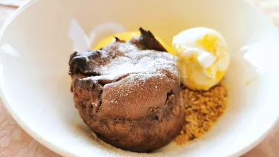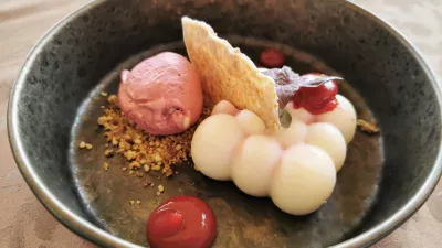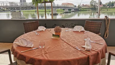 Mimogrede, v novih časih so ob Dravi ukinili malce banalno čokoladno kroglo, ki se pred gostom topi pod vročim prelivom. Vroča ljubezen ali nekaj takega so ji rekli. Zdaj imajo namesto tega res solidno lava tortico z mangovo peno in mangovim sladoledom, ki se natančno rima z biserom iz Ptujske kleti, sladkim vinom Maximus 777. Malo manj je izstopala avtorsko predelana skutina torta z višnjevo kremo in višnjevim sladoledom, preskočili pa smo tiramisu s pomarančo.