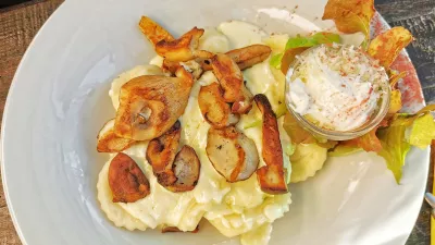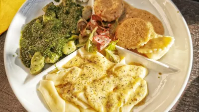Orjaška porcija s fižolom in koruzo v glavni vlogi tudi ni draga: štiri evre in pol. Lahko bi se najedli že s pogačo in bobiči, a zadali smo si obširnejšo nalogo. Poskusili smo nekaj dražje tople predjedi oziroma testenine, med 10 in 15 evrov so, a lahko dobite tudi še vedno velike polovične porcije.