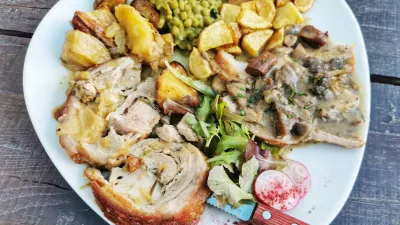 Meso izpod peke, z mnogimi prilogami / Foto: Miha First