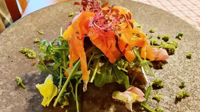 Pri hladnih predjedeh ne ovinkarijo. Za tiste, ki ne jedo mesa, imajo zanimivo, morda celo malce premajhno porcijo bohinjske hladno dimljene postrvi, ki jo podložijo (15 evrov) z Bogatajevo skuto s hrenom ter veliko preveč rukole. Tudi pri narezku predvsem Ažmanovih mesnin in Dolenčevega sira je sodelovala rukola, a so bile druge sestavine bolj domače.
