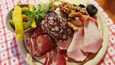Tako divjačinska salama kot sušen svinjski vrat, pršut in šink. Še posebej lahko pohvalimo dimljeno mesnato zaseko. Porcija, ki je uradno za eno, količinsko pa za dve osebi, stane zmernih 12,5 evra.