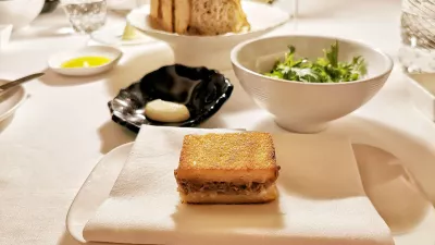 Potem so prvič pokazali dišeč kruh, še topel, z debelo hrustljavo skorjo. Zraven gre spenjeno maslo iz Normandije, potreseno s piransko soljo, in oljčno olje s Sicilije. Kot podlaga toastu oziroma toplemu sendviču, ki so ga namesto s sirom in šunko naložili s škampi, je šla rahlo okisana zelena zeliščna solata, sendvič pa smo pomakali v majonezo z vasabijem. Enostavna, a dobra ideja, podobno kot polži po burgundsko, ki so v tržaški zamisli dobili ob peteršilju tudi kocke hrena in polenovke.