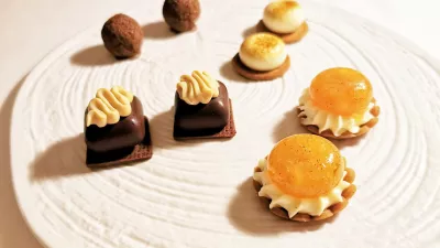 Glavna sladica je bila variacija okusov in tekstur pomaranče, korenja in limone, nam pa je celo bolj ugajal kvartet sladkih grižljajev, s katerimi so se poslovili: pikantna čokolada, čokoladni tartuf, likviricija in tarte tatin v majhnih dozah, ki jih je najbolje zabeliti s požirkom grappe.