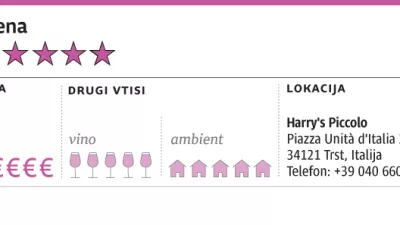 Ko govorimo o računu v dveh velikih jedilnicah z osmimi mizami, je takoj treba reči, da je bila cena menija (220 evrov na osebo) krepko nižja kot v obeh naših najvišje ocenjenih restavracijah v Kobaridu in Kranjski Gori, a je treba reči tudi, da pri sestavinah v Harry'su ni bilo nikakršnega spogledovanja z revno kuhinjo. Nasprotno, sestavine, kakšnih 15, morda 16 večjih ali manjših jedi smo pokusili, so bile v vsakem trenutku na najvišji ravni, pa naj je šlo za morske prebivalce, meso ali zelenjavo.