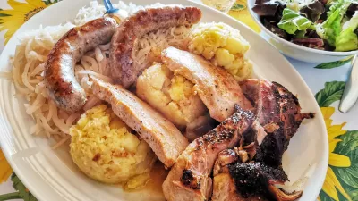Veliko bližje so jim recimo nasitne priloge, kot je praženi krompir, ki sta mu družbo na krožnikih delali naša omiljena kisla repa in kislo zelje. Pa tudi velika solata, ki je bila skoraj v funkciji glavne jedi: domač radič z zeljem, jajcem in česnom.