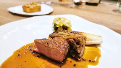 Kozarec intenzivne Wachterjeve modre frankinje 2020, po češnjah dišečega izbora starih trt z Gradiščanskega, je napovedal glavno jed – račje prsi v poprovi omaki, pečen radič, ohrovt in hruška, ki so jim na ločenem krožniku priložili popečeno rezino brioša s kostanjevo kremo s slano karamelo in ocvirki. Neverjeten vrtiljak sladkih in slanih not.