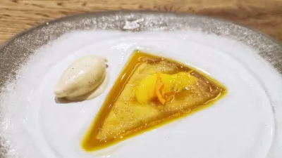 Pa sploh še ni konec. Mlečni sladoled z rdečim poprom, rumena in rdeča grenivka ter drobljenec bele čokolade so na sosednjem krožniku dobili spremljevalca v obliki siciljanskega cannola, v katerem je bila rikota obogatena s pistacijo in rdečim poprom. Simpatična kombinacija, ki pripravi na sladki finale, ko vam pri mizi pripravijo crêpes Suzette ali šaljivo palatschinken Suzy. Spektakel, ki ga velja videti, tudi zaradi gorečih palačink, še bolj pa zaradi klasičnih pomarančnih okusov, ki jih, to je treba priznati, brez vsakih avtorskih izletov povzamejo v originalni različici.