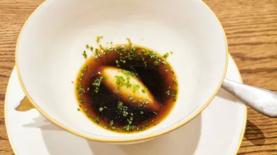 Podpisna, najbolj znana Fuchsova jed je raviol z rumenjakom na kremni špinači, prelit s parmezanovo emulzijo in posut z nastrganimi tartufi iz Périgorda. Najbolj konkretna, gotovo, a tudi najbolj dodelana jed med mnogimi predjedmi. Nato smo hitro spet odpotovali na morje, tokrat z morskim listom, vongolami in klapavicami. Bučni pire in zelena papaja iz bližnjega Stradna dodata v morje nekaj štajerskega, kombinacija pa nedvomno spominja na tajski kari.