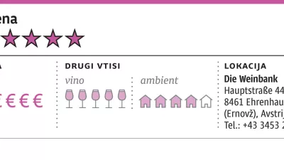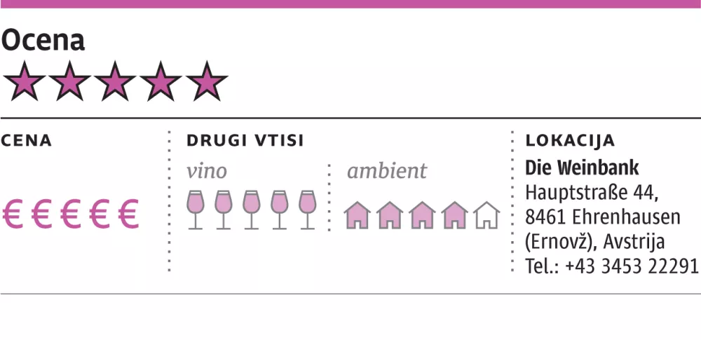 V podobnih primerih uporabljajo v drugih lokalih še manjšo, žepno vinsko karto, kjer so zgolj vina, ki jih priporoča hišni sommelier, ali uporabijo tablico, po kateri je lažje brskati, ali pa objavijo vinsko karto na spletu in jo gostje preštudirajo že prej. Vse skupaj je sicer poenostavila majčkena ponudba vin na kozarec, ob šampanjcu Lombard imajo na kozarec odprti dve lokalni peneči vini, solidnega Regeleja (13 evrov) iz čistega chardonnayja in ekološkega, zelo sadnega in rahlo prekislega Taussa (10 evrov) iz modre frankinje in kančka caberneta. Na začetku se lahko odločite tudi za hišni vermut in kak ducat belih vin, denimo zanimiv zrel sauvignon (7,5 evra), ki so ga za peščico najboljših avstrijskih restavracij, med njimi Die Weinbank, pridelali v kleti Jaunegg. In ker je Weinbank dom vin iz znamenite kleti Tement, ki ima del vinogradov tudi na naši strani meje, smo v večjem delu večerje pili dišeč in bogat hišni morillon Sulz 2018 za znosnih 55 evrov.