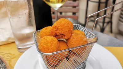Ob tem nam ni dalo miru nekaj, kar smo slišali med naštevanjem predjedi – olive all'ascolana, specialiteta iz mesta Ascoli v Markah v osrednji Italiji, kjer olive napolnijo z mesom in ocvrejo. Prigrizek, ki bi ga jedli tudi ob televiziji, smo si tokrat privoščili ob glavni jedi. Na Trubarjevi v tej kategoriji ponujajo le dve jedi, tunino in govejo taljato, mi smo tisti večer jedli meso. Lepo pečeno mehko govedino položijo čez rukolo in češnjeve paradižnike treh barv, potresejo s parmezanom in pokapljajo z balzamičnim kisom. Okusna jed, predvsem pa spet ugodna cena – marsikje po Sloveniji bi šla prek 30 evrov, v atriju na Trubarjevi stane 19 evrov.