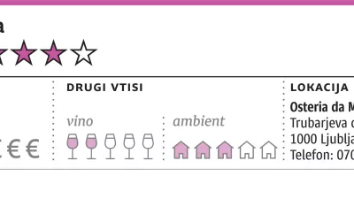 Italijanska gostilna v centru Ljubljane, ki želi konkurirati z nižjimi cenami. Nič nimamo proti. Ponudba je enostavna, a se v vsaki fazi najde kaj dobrega, naj bodo to hladne predjedi, testenine ali taljata. Vinska ponudba niti približno ne doseže hrane. Malce se bodo morali usesti in najti kakšne rešitve, vina enega samega vinarja enostavno ne zadostujejo.