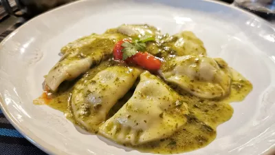 Prinčičevo vino je ostalo v kozarcih tudi ob raviolih z rikoto v pestu iz rukole, na drugi strani so k rezancem skuhali ragu divjega prašiča. Ne moremo se odločiti, katere testenine so bile boljše, sta pa obe res konkretni porciji stali po 16 evrov. Morda malce pretiravamo, a za trenutek se nam je zdelo, da Hladik spominja na zdaj že kar slavno Tavernetto v Vidmu, lokal je podobno opremljen z množico vinskih paketov in kartonov ter tisoči steklenic, ki so jih gostje spili v preteklosti. Je pa ponudba manj široka, še posebej, ko gre za vina. Čeprav …