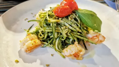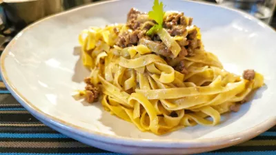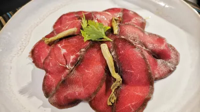 Naj še enkrat poudarimo, da je jedilnik enostaven, na njem sta dve hladni predjedi, dve topli, tri glavne jedi in sladice, na tabli pa je zapisano, da imajo vedno na voljo tudi pršut krminskega mojstra D'Osvalda. Naša ideja je bila, da se zapodimo na jelenov karpačo z gorskim radičem (18 evrov), zraven gre oljčno olje Gradassi, vse skupaj pa počiva ne na rukoli, ampak na motovilcu. Na mizi so beli in črni kruh ter grisini, ob friulanu Gradis'ciutta pa so postregli še zanimive bučkine špagete s pestom in gamberi (14 evrov).