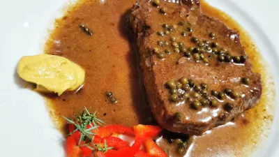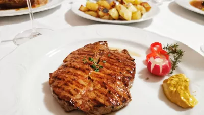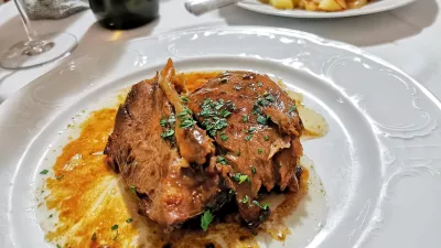 Dva velika pečena kosa mesa, ki ne potrebujeta razlage, samo lačna usta. Je pa to seveda draga zabava, kot smo se navadili v zadnjih letih, za takšno meso pripravite 30 evrov. Občutno manj, 12 evrov, stane velika porcija zelo mehke telečje krače, ki jo radi priporočijo, poleg množice zrezkov pa imajo v rubriki dobro in poceni še polnjene telečje prsi.