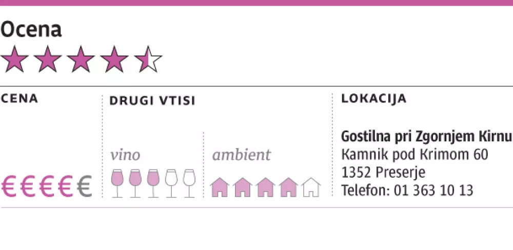 Kljub temu da se osnovna ponudba pri Zgornjem Kirnu od našega zadnjega obiska ni veliko spremenila, se zdijo recepti sveži ali pa, kot smo že večkrat napovedali, se je ponudba naših gostiln v zadnjih 15 letih spreminjala in spreminjala ter se na koncu v marsičem vrnila h koreninam. Morda je edina stvar, ki smo jo pod Krimom zares pogrešali, jedilni list in po drugi strani vinski list, ki pa ga je nadomestil mladi gospodar, ki je kar na mizo prinašal zelo zanimive buteljke.
