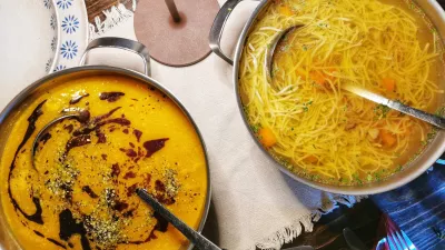 Povsem enostavna, lahko bi rekli kar tradicionalna, je bila goveja juha z rezanci, z nekaj govejega mesa in korenja. Manj znan je recept bučne juhe, ki je bila nekoliko manj gosta, kot smo vajeni. Hkrati ji razen kapljice dišečega bučnega olja ne dodajo prikuhe, pa je bila vseeno sijajna. Morda tudi zato, ker so se zelo topli dnevi poslovili in počasi prihaja čas, ko bodo naša telesa namesto solat in hladnih jedi bolj povpraševala po topli hrani.