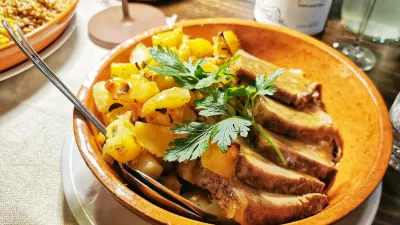 Velike porcije mesa so podprli z enostavno mešano solato z bučnim oljem, priloge pa so bile več kot obilne in nekatere med njimi zelo nasitne: pri pojedini so sodelovali pečeni krompir izpod peke, sirovi štruklji, ajdova kaša z gobami in ješprenj z zelenjavo.