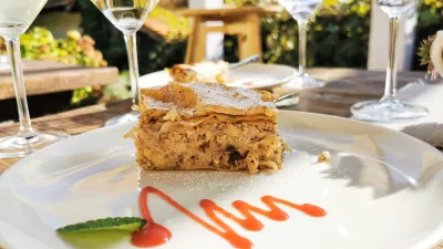 Štrudelj, zavitek ali gibanica so lahko delovna imena za eno najintenzivnejših sladic, ki smo jih pomalicali v zadnjem času. Na kmetiji so v testo, ki je bilo na voljo, zavili jabolka, orehe, skuto in rozine. Zraven skuhajo domačo kavo, naša ekspedicija pa priporoča tudi, omenili smo ga že, lokalni tempel.