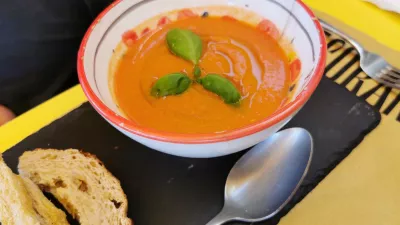 Če je ponudba pijače v primerjavi z uglednimi restavracijami pravzaprav zelo borna, ima restavracija, vsaj za picerijo, izredno široko ponudbo hrane. Predvsem je veliko poletnih hladnih intervencij, solat in brusket. Gaspačo ni nič drugačen kot v Sloveniji, je pa brez vseh prilog, če odštejemo namerno popečen in malce pretrd kruh, ki spremlja pravzaprav vse jedi. Trinajst evrov se zdi za takšno hladno juho skoraj malce preveč, a Azurna obala ima podobno kot Ljubljana drugačne cene kot realni svet.
