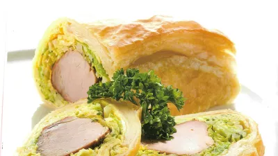 Svinjsko ribico začinimo s soljo in poprom ter opečemo na vroči maščobi. Opečeno namažemo z gorčico in pustimo, da se ohladi. Ohrovt očistimo in narežemo na rezance. V kozici stopimo maslo in na hitro popražimo sesekljan česen, da zadiši. Takoj primešamo narezan ohrovt, ga solimo in dušimo približno 10 minut. Dodamo sesekljan peteršilj in dobro premešamo. Listnato testo na tanko razvaljamo ter ga namažemo z razžvrkljanim jajcem in dušenim ohrovtom. Na to podlago položimo pečeno svinjsko ribico, jo zavijemo v testo in še po zunanji strani namažemo z jajcem. Položimo jo v pekač, obložen s papirjem za peko, in pečemo pri temperaturi 200 stopinj Celzija približno 20 minut.