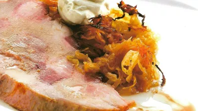 Svinjsko stegno natremo s soljo in kumino. Slanino narežemo na trakove in jih zataknemo v svinjsko stegno, v katero smo z nožem zarezali žepke. Kislemu zelju dodamo sesekljan česen, na drobno narezano čebulo, sladko papriko, lovorov list, solimo in popramo in vse skupaj dobro premešamo. V ognjevarno posodo damo pripravljeno zelje in nanj položimo pečenko ter vse skupaj prelijemo z oljem. Pekač pokrijemo z aluminijasto folijo in ga postavimo v pečico, ogreto na 150 stopinj Celzija. Pečenko z zeljem pečemo približno uro in pol. Za prilogo ponudimo pire krompir.